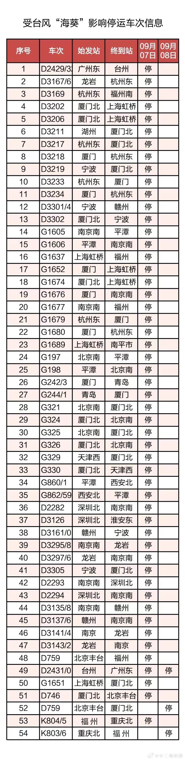 截至9月6日22時(shí),計(jì)劃停運(yùn)9月7日至9月8日間共54趟旅客列車(chē):其中停運(yùn)動(dòng)車(chē)組列車(chē)52趟,停運(yùn)普速列車(chē)2趟。