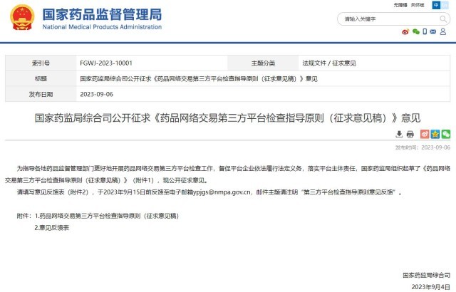 國(guó)家藥監(jiān)局就《藥品網(wǎng)絡(luò)交易第三方平臺(tái)檢查指導(dǎo)原則(征求意見稿)》公開征求意見