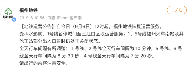 福州地鐵9月6日12時(shí)起恢復(fù)運(yùn)營(yíng)服務(wù)
