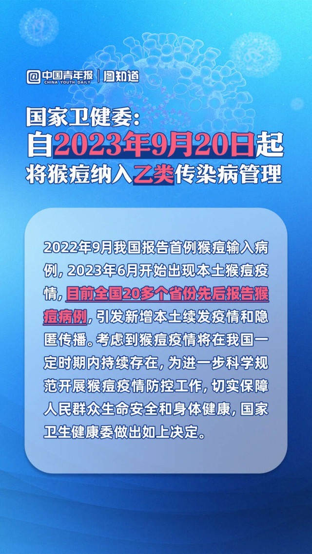 今年以來,我國已有20多個省份先后報告猴痘病例,引發(fā)新增本土續(xù)發(fā)疫情和隱匿傳播。國家衛(wèi)健委9月15日發(fā)布公告稱,自2023年9月20日起將猴痘納入乙類傳染病進(jìn)行管理,采取乙類傳染病的預(yù)防、控制措施。