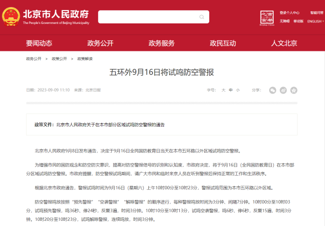 北京市人民政府9月8日發(fā)布通告,決定于9月16日全民國(guó)防教育日當(dāng)天在本市五環(huán)路以外區(qū)域試?guó)Q防空警報(bào)。