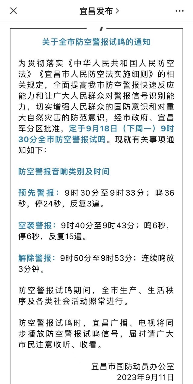 據(jù)宜昌市國(guó)防動(dòng)員辦公室通知,宜昌市定于9月18日9時(shí)30分全市防空警報(bào)試?guó)Q。