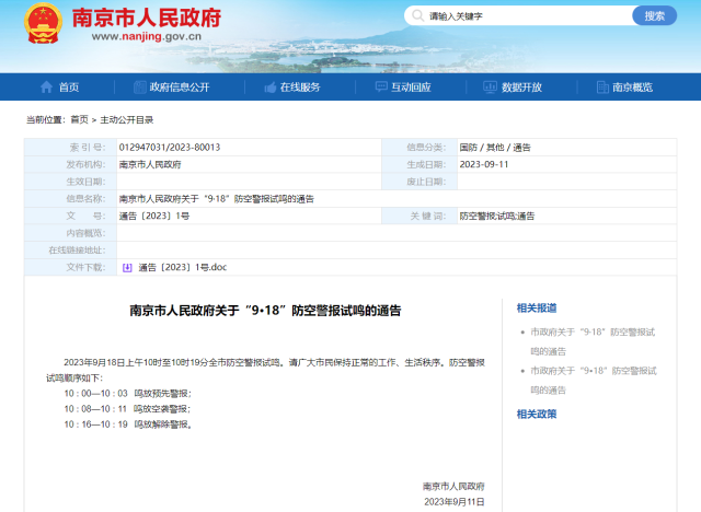 據(jù)南京市人民政府通告,9月18日上午10時(shí)至10時(shí)19分南京全市防空警報(bào)試?guó)Q。