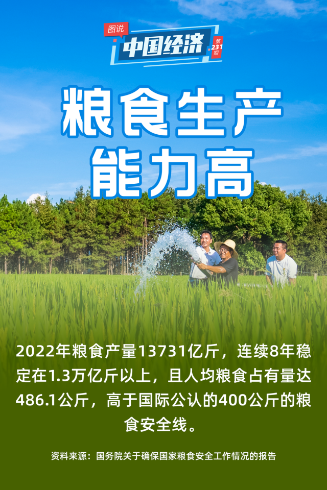 今年以來(lái),極端氣候干擾全球農(nóng)業(yè)生產(chǎn),關(guān)于糧食安全的擔(dān)憂在全球蔓延。就我國(guó)糧食生產(chǎn)情況而言,國(guó)務(wù)院關(guān)于確保國(guó)家糧食安全工作情況的報(bào)告顯示,2022年,我國(guó)糧食產(chǎn)量13731億斤,連續(xù)8年穩(wěn)定在1.3萬(wàn)億斤以上,且人均糧食占有量達(dá)486.1公斤,高于國(guó)際公認(rèn)的400公斤的糧食安全線。