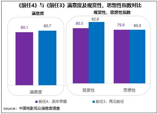 由田羽生執(zhí)導(dǎo),韓庚、鄭愷主演的都市愛情輕喜劇電影《前任4:英年早婚》觀眾滿意度80.1分,與六年前上映的系列上一部《前任3:再見前任》相差不大,略下降0.6分;其中二者思想性得分幾近持平,觀賞性下降了2.3分。