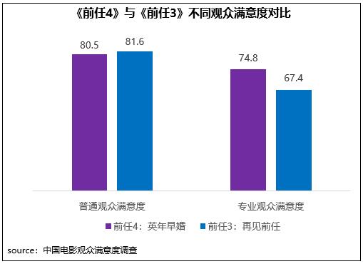 《前任4:英年早婚》在同系列影片輕松、寫實創(chuàng)作風(fēng)格基礎(chǔ)上,進(jìn)階到婚姻話題探討,并進(jìn)一步強化對觀眾現(xiàn)實情感生活的細(xì)致洞察,成為當(dāng)代人的愛情圖鑒。在不同觀眾評價中,影片相對更受專業(yè)觀眾的青睞,專業(yè)觀眾滿意度得分74.8分,高于上一部作品7.4分,其中精彩對白、傳播方式得分居檔期第二和第三位;但普通觀眾對其評價一般,滿意度得分80.5分,比上一部低1.1分。