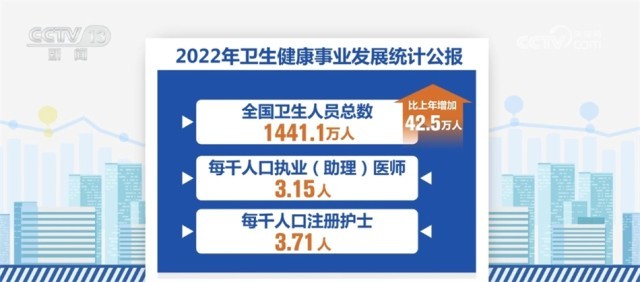 《公報(bào)》顯示,我國(guó)醫(yī)療衛(wèi)生資源總量繼續(xù)增加。到2022年末,全國(guó)醫(yī)療衛(wèi)生機(jī)構(gòu)達(dá)到1032918個(gè),比上年增加1983個(gè)。全國(guó)共設(shè)置13個(gè)類(lèi)別的國(guó)家醫(yī)學(xué)中心和兒童類(lèi)別的國(guó)家區(qū)域醫(yī)療中心。全國(guó)醫(yī)療衛(wèi)生機(jī)構(gòu)床位975.0萬(wàn)張,每千人口醫(yī)療衛(wèi)生機(jī)構(gòu)床位數(shù)由2021年的6.70張?jiān)黾拥?022年的6.92張。全國(guó)衛(wèi)生人員總數(shù)1441.1萬(wàn)人,比上年增加42.5萬(wàn)人。每千人口執(zhí)業(yè)(助理)醫(yī)師3.15人,每千人口注冊(cè)護(hù)士3.71人。