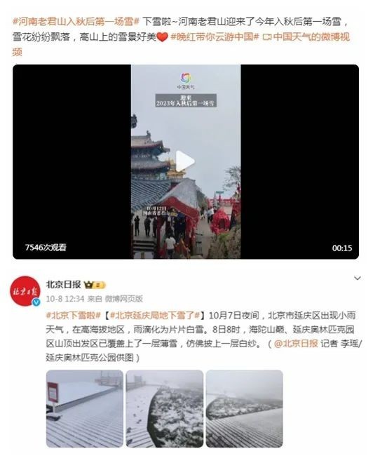 而在此之前,河南老君山就已經(jīng)迎來(lái)了入秋以來(lái)的第一場(chǎng)雪,甚至在北京延慶的高海拔山區(qū)也迎來(lái)了降雪。
