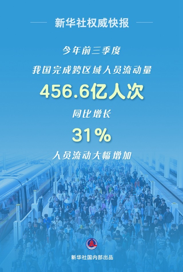 我國完成跨區(qū)域人員流動量456.6億人次,同比增長31%,跨區(qū)域人員流動量超過疫情前同期水平