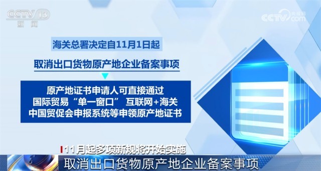 海關(guān)總署決定自11月1日起,取消出口貨物原產(chǎn)地企業(yè)備案事項(xiàng),原產(chǎn)地證書申請(qǐng)人可直接通過國際貿(mào)易“單一窗口”“互聯(lián)網(wǎng)+海關(guān)”、中國貿(mào)促會(huì)申報(bào)系統(tǒng)等申領(lǐng)原產(chǎn)地證書,進(jìn)一步優(yōu)化跨境貿(mào)易營商環(huán)境,提升貿(mào)易便利。