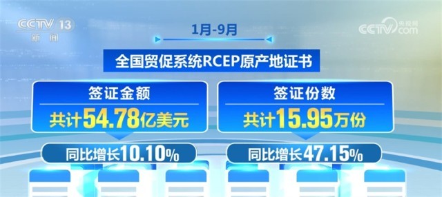 1月—9月,全國貿(mào)促系統(tǒng)RCEP原產(chǎn)地證書簽證金額共計54.78億美元,同比增長10.10%;簽證份數(shù)共計15.95萬份,同比增長47.15%。