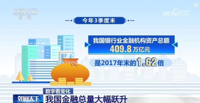最新數(shù)據(jù)顯示,今年3季度末,我國(guó)銀行業(yè)金融機(jī)構(gòu)資產(chǎn)總額為409.8萬(wàn)億元,是2017年末的1.62倍。銀行業(yè)金融機(jī)構(gòu)本外幣貸款余額239.5萬(wàn)億元,是2017年末的1.91倍。本外幣存款余額286.6萬(wàn)億元,是2017年末的1.69倍。保險(xiǎn)方面,3季度末,保險(xiǎn)公司總資產(chǎn)29.6萬(wàn)億元,是2017年末的1.77倍。從2018年到今年3季度末,保險(xiǎn)公司賠款與給付累計(jì)支出8.4萬(wàn)億元,保險(xiǎn)的保障功能日益突出。