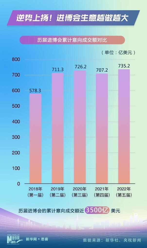 2018年11月,首屆進(jìn)博會(huì)在上海“初試啼聲”。之后,進(jìn)博會(huì)不顧風(fēng)雨和險(xiǎn)阻,年年如約而至、越辦越好。數(shù)據(jù)顯示,進(jìn)博會(huì)的累計(jì)意向成交額從2018年的578.3億美元,上升到2022年的735.2億美元。前五屆進(jìn)博會(huì)的累計(jì)意向成交額近3500億美元。進(jìn)博會(huì)生意越做越大。