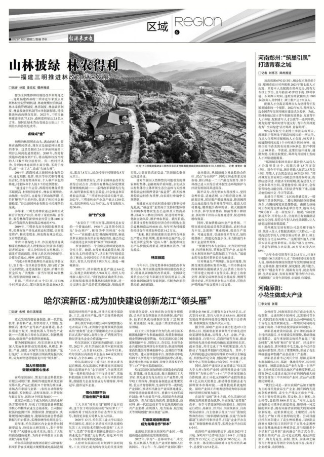 “首張林票發(fā)行、首個(gè)全國林業(yè)改革發(fā)展綜合試點(diǎn)市、首創(chuàng)國有林場差異化績效管理激勵(lì)機(jī)制……一系列改革舉措先行先試,始終緊扣實(shí)現(xiàn)生態(tài)效益、社會效益和百姓收益共贏?!比魇辛謽I(yè)局局長陳平說,2022年,三明市林業(yè)產(chǎn)業(yè)總產(chǎn)值達(dá)1258億元,農(nóng)民涉林收入達(dá)7107元,占可支配收入的30.6%。