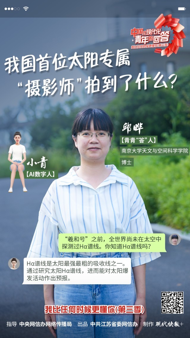 11月7日,“中國(guó)式現(xiàn)代化·青年的回答——我比任何時(shí)候更懂你(第三季)”系列短視頻之《我國(guó)首位太陽(yáng)專(zhuān)屬“攝影師”拍到了什么?》正式上線。本集視頻中,青青“答”人——南京大學(xué)天文與空間科學(xué)學(xué)院博士邱曄和AI數(shù)字人小青,為大家展示了我國(guó)首顆探日衛(wèi)星“羲和號(hào)”拍攝到的畫(huà)面,解釋了“羲和號(hào)”超長(zhǎng)全稱(chēng)里的兩個(gè)關(guān)鍵詞的含義。