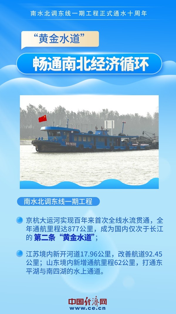 2002年,京杭大運(yùn)河被納入南水北調(diào)東線工程。2022年,京杭大運(yùn)河實(shí)現(xiàn)百年來首次全線水流貫通。受益于東線一期工程的水量保障,目前京杭大運(yùn)河的全年通航里程達(dá)877公里,大大提高了區(qū)域水運(yùn)能力,成為國(guó)內(nèi)僅次于長(zhǎng)江的第二條“黃金水道”。