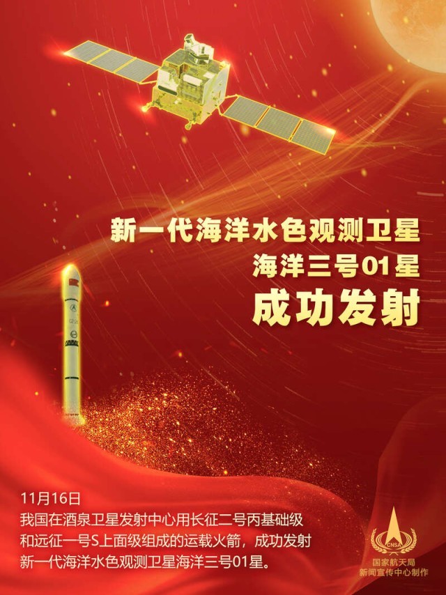 中國青年報客戶端北京11月16日電(張未 王豪 李儀 中青報·中青網(wǎng)記者 邱晨輝)北京時間11月16日11時55分,我國在酒泉衛(wèi)星發(fā)射中心用長征二號丙基礎級和遠征一號S上面級組成的運載火箭,成功發(fā)射新一代海洋水色觀測衛(wèi)星海洋三號01星。該衛(wèi)星指標達到國際水色遙感衛(wèi)星先進水平,可滿足我國海洋環(huán)境監(jiān)測的主體業(yè)務需求,并能夠服務于生態(tài)文明建設、智慧海洋工程建設、“一帶一路”倡議等國家重大戰(zhàn)略需求。