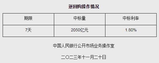 中新網(wǎng)11月20日電 據(jù)央行網(wǎng)站消息,為維護(hù)銀行體系流動(dòng)性合理充裕,2023年11月20日人民銀行以利率招標(biāo)方式開(kāi)展了2050億元逆回購(gòu)操作,中標(biāo)利率1.80%,期限為7天。具體情況如下: