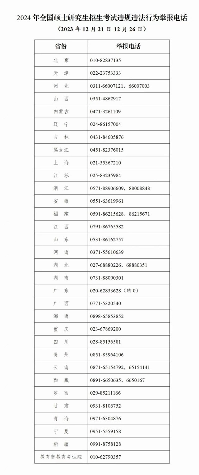 教育部和各?。▍^(qū)、市)教育招生考試機(jī)構(gòu)將開通2024年研考舉報(bào)電話,歡迎廣大考生及社會(huì)各界人士及時(shí)舉報(bào)反映有關(guān)問題線索。教育部及各?。▍^(qū)、市)將會(huì)同有關(guān)部門根據(jù)舉報(bào)線索第一時(shí)間核查處理,堅(jiān)決維護(hù)風(fēng)清氣正的研考環(huán)境。