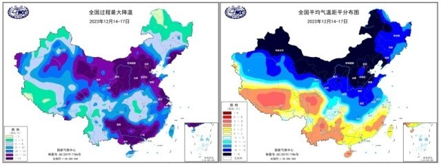 12月14-17日全國大部降溫迅猛(左)氣溫遠(yuǎn)低于歷史同期(右,“距平”為實測數(shù)據(jù)與歷史同期之差)