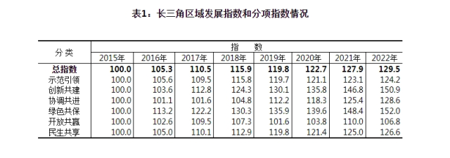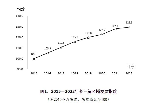 從測(cè)算結(jié)果看,以2015年為基期,2022年長(zhǎng)三角區(qū)域發(fā)展指數(shù)為129.5,比上年提高1.6,年均提高4.2。