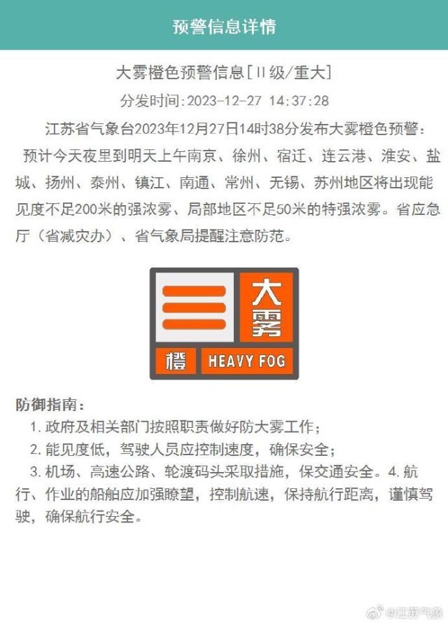 央視網(wǎng)消息:據(jù)@江蘇氣象 微博消息,江蘇省氣象臺(tái)2023年12月27日14時(shí)38分發(fā)布大霧橙色預(yù)警: 預(yù)計(jì)今天夜里到明天上午南京、徐州、宿遷、連云港、淮安、鹽城、揚(yáng)州、泰州、鎮(zhèn)江、南通、常州、無(wú)錫、蘇州地區(qū)將出現(xiàn)能見度不足200米的強(qiáng)濃霧、局部地區(qū)不足50米的特強(qiáng)濃霧。江蘇省應(yīng)急廳(省減災(zāi)辦)、省氣象局提醒注意防范。