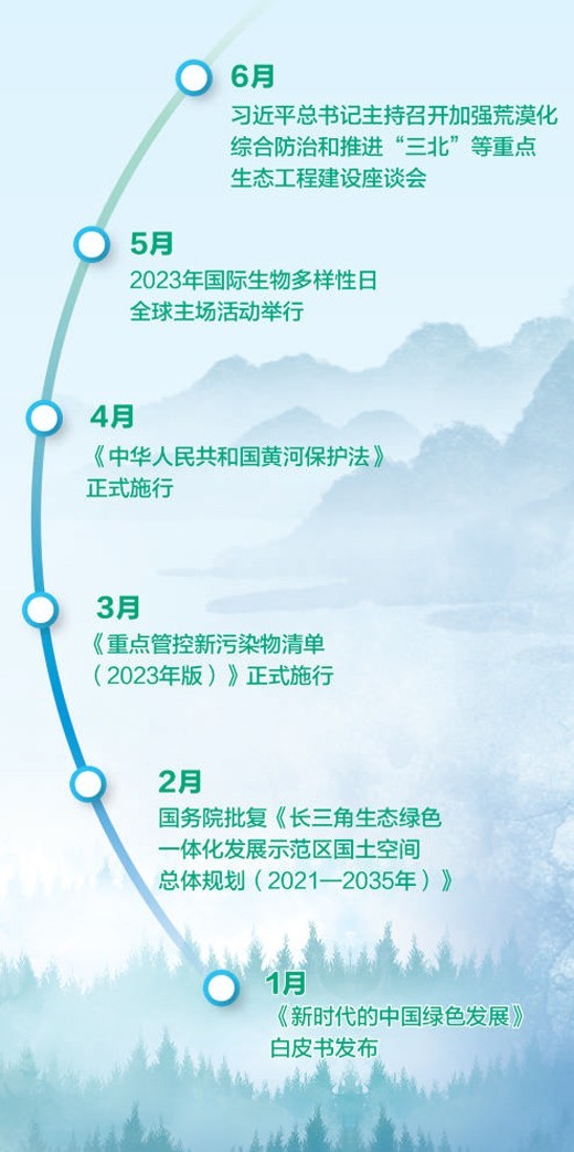 總結(jié)新時(shí)代10年的實(shí)踐經(jīng)驗(yàn),我們對(duì)生態(tài)文明建設(shè)的規(guī)律性認(rèn)識(shí)不斷深化。2023年是我國(guó)生態(tài)文明建設(shè)道路上具有里程碑意義的一年。這一年,我國(guó)天更藍(lán)、地更綠、水更清,美麗中國(guó)建設(shè)交出滿意答卷,人民群眾獲得感、幸福感、安全感顯著增強(qiáng)。這一年,全國(guó)生態(tài)環(huán)境保護(hù)大會(huì)召開(kāi),我國(guó)迎來(lái)首個(gè)全國(guó)生態(tài)日,黃河保護(hù)法正式施行,“三北”工程三大標(biāo)志性戰(zhàn)役開(kāi)局順利,綠色低碳發(fā)展腳步不斷加快。