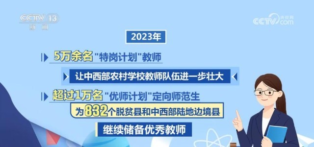 強教必先強師。2023年,5萬余名“特崗計劃”教師讓中西部農(nóng)村學(xué)校教師隊伍進(jìn)一步壯大,超過1萬名“優(yōu)師計劃”定向師范生為832個脫貧縣和中西部陸地邊境縣繼續(xù)儲備優(yōu)秀教師。