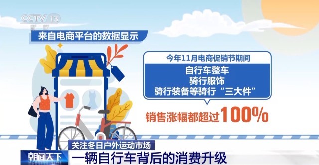 來自電商平臺(tái)的數(shù)據(jù)顯示,今年11月電商促銷節(jié)期間,自行車整車、騎行服飾、騎行裝備等騎行“三大件”的銷售漲幅都超過100%。其中公路自行車暴漲300%、自行車碼表及配件增長230%。