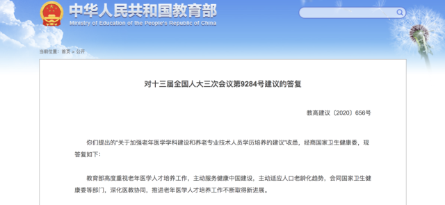 早在2021年,教育部官網(wǎng)曾公布《對(duì)十三屆全國(guó)人大三次會(huì)議第9284號(hào)建議的答復(fù)》,下一步,教育部將進(jìn)一步加強(qiáng)面向全體醫(yī)學(xué)類專業(yè)學(xué)生開展老年醫(yī)學(xué)教育,同時(shí),協(xié)同國(guó)家衛(wèi)生健康委,鼓勵(lì)高校加強(qiáng)老年醫(yī)學(xué)學(xué)科建設(shè)、推進(jìn)老年醫(yī)學(xué)專科醫(yī)師規(guī)范化培訓(xùn)。