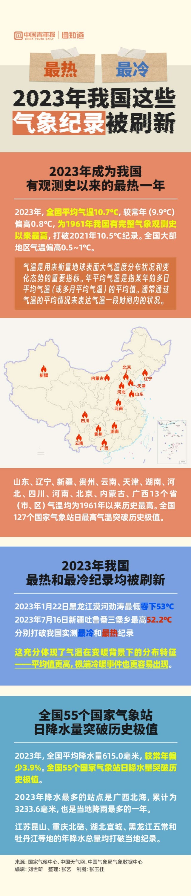 高溫、暴雨、寒潮……回顧2023年,你是否也感受到了天氣的不尋常?2023年,我國最熱和最冷紀錄均被刷新。這些變化也反映了氣溫在全球變暖背景下的分布特征——平均值更高,極端冷暖事件也更容易出現(xiàn)。我國是全球氣候變化的敏感區(qū)和影響顯著區(qū)。關(guān)注氣候變化,一起看圖了解。