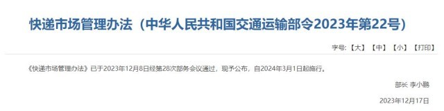 央視網(wǎng)消息:《快遞市場管理辦法》已于2023年12月8日經(jīng)第28次部務(wù)會(huì)議通過,現(xiàn)予公布,自2024年3月1日起施行。