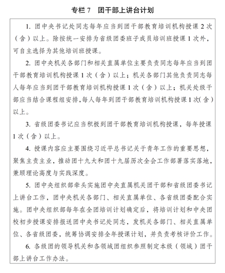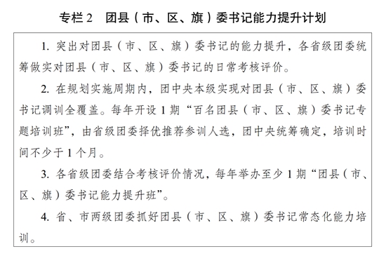 ?。ǘ┩怀觥瓣P(guān)鍵少數(shù)”政治訓(xùn)練。堅(jiān)持把政治訓(xùn)練貫穿團(tuán)干部成長(zhǎng)全周期,使團(tuán)干部的政治素養(yǎng)、政治能力與擔(dān)負(fù)的領(lǐng)導(dǎo)職責(zé)相匹配。強(qiáng)化“一把手”政治培訓(xùn),有計(jì)劃地選調(diào)團(tuán)的各級(jí)領(lǐng)導(dǎo)機(jī)關(guān)主要負(fù)責(zé)同志到團(tuán)干部教育培訓(xùn)機(jī)構(gòu)參加專(zhuān)題培訓(xùn)。強(qiáng)化對(duì)團(tuán)縣(市、區(qū)、旗)委書(shū)記這一群體的培訓(xùn),實(shí)施團(tuán)縣(市、區(qū)、旗)委書(shū)記能力提升計(jì)劃(專(zhuān)欄2)。突出對(duì)團(tuán)的領(lǐng)導(dǎo)機(jī)關(guān)干部的政治訓(xùn)練,各級(jí)團(tuán)的領(lǐng)導(dǎo)機(jī)關(guān)加強(qiáng)對(duì)機(jī)關(guān)干部的常態(tài)化政治能力培訓(xùn)。加強(qiáng)對(duì)青年人才的政治引領(lǐng),團(tuán)中央組織部會(huì)同有關(guān)單位每年組織一定數(shù)量青年人才開(kāi)展國(guó)情研修。積極推動(dòng)將地方團(tuán)的領(lǐng)導(dǎo)機(jī)關(guān)班子成員培訓(xùn)納入地方黨委組織開(kāi)展的干部政治理論培訓(xùn)范疇。