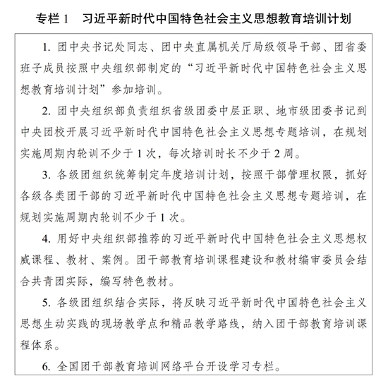 (一)聚焦聚力,久久為功。完善團(tuán)干部理論教育培訓(xùn)長(zhǎng)效機(jī)制,落實(shí)黨的創(chuàng)新理論學(xué)習(xí)教育計(jì)劃,組織實(shí)施習(xí)近平新時(shí)代中國(guó)特色社會(huì)主義思想教育培訓(xùn)計(jì)劃(專(zhuān)欄1),系統(tǒng)謀劃、持續(xù)用力,不斷把思想鑄魂、理論武裝工作引向深入。堅(jiān)持把習(xí)近平新時(shí)代中國(guó)特色社會(huì)主義思想作為團(tuán)的各級(jí)領(lǐng)導(dǎo)機(jī)關(guān)班子成員理論學(xué)習(xí)中心組學(xué)習(xí)首要內(nèi)容,作出具體安排、精心組織實(shí)施;作為各級(jí)團(tuán)干部教育培訓(xùn)機(jī)構(gòu)的主課必修課,辦好理論進(jìn)修班、理論研修班;作為團(tuán)干部學(xué)習(xí)的中心內(nèi)容,全面系統(tǒng)學(xué)、持續(xù)深入學(xué)、聯(lián)系實(shí)際學(xué)。以縣處級(jí)及以上團(tuán)干部為重點(diǎn),開(kāi)展習(xí)近平新時(shí)代中國(guó)特色社會(huì)主義思想和黨的二十大精神集中輪訓(xùn);深入開(kāi)展主題教育,通過(guò)專(zhuān)題學(xué)習(xí)、研討交流、主題黨課、調(diào)查研究、建章立制等形式,推動(dòng)黨的創(chuàng)新理論學(xué)習(xí)教育走深走實(shí)走心,使廣大團(tuán)干部更加深刻領(lǐng)悟“兩個(gè)確立”的決定性意義,更加自覺(jué)增強(qiáng)“四個(gè)意識(shí)”、堅(jiān)定“四個(gè)自信”、做到“兩個(gè)維護(hù)”。深入開(kāi)展習(xí)近平總書(shū)記關(guān)于青年工作的重要思想學(xué)習(xí)培訓(xùn),使廣大團(tuán)干部學(xué)習(xí)掌握黨的青年工作的地位作用、目標(biāo)任務(wù)、職責(zé)使命、實(shí)踐要求,為做好新時(shí)代新征程黨的青年工作打牢思想基礎(chǔ)。