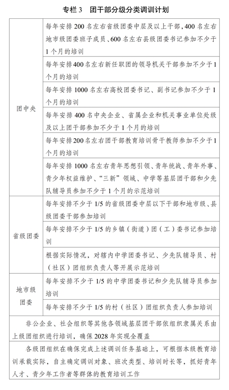 ?。ǘ﹫?jiān)持分級(jí)分類(lèi)。根據(jù)各級(jí)團(tuán)的領(lǐng)導(dǎo)機(jī)關(guān)干部、高校團(tuán)干部、國(guó)有企業(yè)和機(jī)關(guān)事業(yè)單位單位團(tuán)干部、中學(xué)團(tuán)干部、鄉(xiāng)鎮(zhèn)(街道)團(tuán)(工)委書(shū)記、村(社區(qū))團(tuán)組織負(fù)責(zé)人、非公企業(yè)、社會(huì)組織等其他各領(lǐng)域基層團(tuán)干部的不同對(duì)象特點(diǎn),把團(tuán)干部履職能力培訓(xùn)的普遍性要求與不同類(lèi)別、不同層級(jí)、不同崗位團(tuán)干部的特殊需要結(jié)合起來(lái),整合優(yōu)質(zhì)資源,加強(qiáng)團(tuán)干部教育培訓(xùn)機(jī)構(gòu)與黨校(行政學(xué)院)、干部學(xué)院、黨性教育基地等的合作聯(lián)動(dòng),多渠道多方面開(kāi)展履職能力培訓(xùn),切實(shí)增強(qiáng)教育培訓(xùn)的時(shí)代性、系統(tǒng)性、針對(duì)性、有效性。發(fā)揮中央團(tuán)校、全國(guó)青少年井岡山革命傳統(tǒng)教育基地主體作用,圍繞黨的中心任務(wù)、黨中央重大決策部署和國(guó)家重大戰(zhàn)略需求開(kāi)展專(zhuān)題培訓(xùn);發(fā)揮全國(guó)團(tuán)干部教育培訓(xùn)基地優(yōu)勢(shì),開(kāi)展政策解讀、重點(diǎn)任務(wù)落實(shí)等專(zhuān)題培訓(xùn);發(fā)揮地方團(tuán)干部教育培訓(xùn)機(jī)構(gòu)優(yōu)勢(shì),開(kāi)展基層團(tuán)干部實(shí)務(wù)培訓(xùn);發(fā)揮全國(guó)團(tuán)干部教育培訓(xùn)網(wǎng)絡(luò)平臺(tái)作用,抓好履職通識(shí)培訓(xùn);加強(qiáng)與派出單位、接收單位的協(xié)作,抓好援派幫扶干部人才、掛職干部等教育培訓(xùn)。積極創(chuàng)造條件,支持干部在職自學(xué)。實(shí)施團(tuán)干部分級(jí)分類(lèi)調(diào)訓(xùn)計(jì)劃(專(zhuān)欄3)。