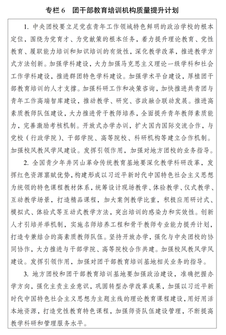 (一)培訓(xùn)機(jī)構(gòu)建設(shè)。加強(qiáng)團(tuán)干部教育培訓(xùn)機(jī)構(gòu)規(guī)范管理和質(zhì)量提升,推進(jìn)各級(jí)團(tuán)校、團(tuán)干部教育培訓(xùn)基地建設(shè),構(gòu)建以中央團(tuán)校、全國(guó)青少年井岡山革命傳統(tǒng)教育基地為龍頭,各級(jí)團(tuán)校、團(tuán)干部教育培訓(xùn)基地相互補(bǔ)充、布局合理、規(guī)范有序的培訓(xùn)機(jī)構(gòu)體系,強(qiáng)化中央團(tuán)校對(duì)地方團(tuán)校的業(yè)務(wù)指導(dǎo),不斷提高辦學(xué)水平。加強(qiáng)各類(lèi)團(tuán)干部教育培訓(xùn)機(jī)構(gòu)規(guī)范管理,開(kāi)展團(tuán)干部教育培訓(xùn)機(jī)構(gòu)辦學(xué)質(zhì)量評(píng)估。支持各地各級(jí)團(tuán)組織聯(lián)合開(kāi)展培訓(xùn),鼓勵(lì)團(tuán)干部教育培訓(xùn)機(jī)構(gòu)開(kāi)展區(qū)域協(xié)作交流,推動(dòng)優(yōu)質(zhì)培訓(xùn)資源共建共享。實(shí)施團(tuán)干部教育培訓(xùn)機(jī)構(gòu)質(zhì)量提升計(jì)劃(專(zhuān)欄6)。