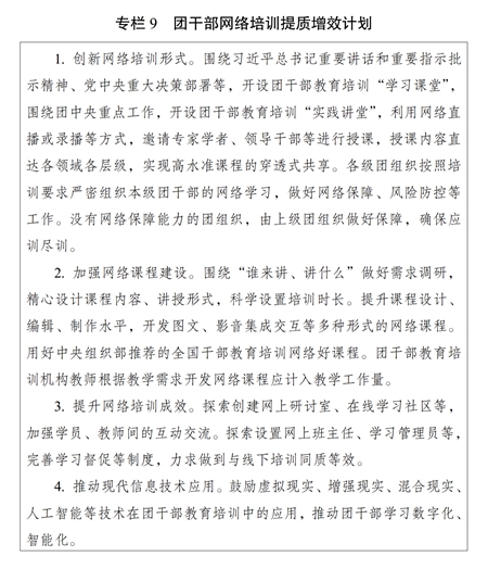 ?。ǘ┘訌?qiáng)網(wǎng)絡(luò)培訓(xùn)課程建設(shè)。鼓勵(lì)團(tuán)干部教育培訓(xùn)機(jī)構(gòu)開(kāi)發(fā)精品網(wǎng)絡(luò)課程。注重把握網(wǎng)絡(luò)教學(xué)特點(diǎn)和規(guī)律,改進(jìn)授課方式,提高制作水平,豐富呈現(xiàn)形式,提升課程質(zhì)量。嚴(yán)把網(wǎng)絡(luò)課程政治關(guān)、質(zhì)量關(guān),規(guī)范講授、制作、審核、發(fā)布和更新、退出流程。充分發(fā)揮網(wǎng)絡(luò)培訓(xùn)優(yōu)勢(shì),推動(dòng)優(yōu)質(zhì)資源下基層。用好網(wǎng)絡(luò)直播培訓(xùn)形式,增強(qiáng)現(xiàn)場(chǎng)體驗(yàn)感。實(shí)施團(tuán)干部網(wǎng)絡(luò)培訓(xùn)提質(zhì)增效計(jì)劃(專(zhuān)欄9)。
