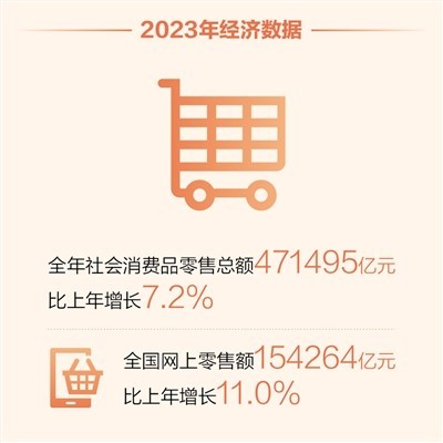 消費(fèi)規(guī)模再創(chuàng)新高。2023年社會(huì)消費(fèi)品零售總額達(dá)47.1萬億元,總量創(chuàng)歷史新高,比上年增長(zhǎng)7.2%。按消費(fèi)類型分,商品零售增長(zhǎng)5.8%,餐飲收入增長(zhǎng)20.4%。全國(guó)網(wǎng)上零售額154264億元,比上年增長(zhǎng)11.0%;其中,實(shí)物商品網(wǎng)上零售額增長(zhǎng)8.4%,占社會(huì)消費(fèi)品零售總額的比重為27.6%。