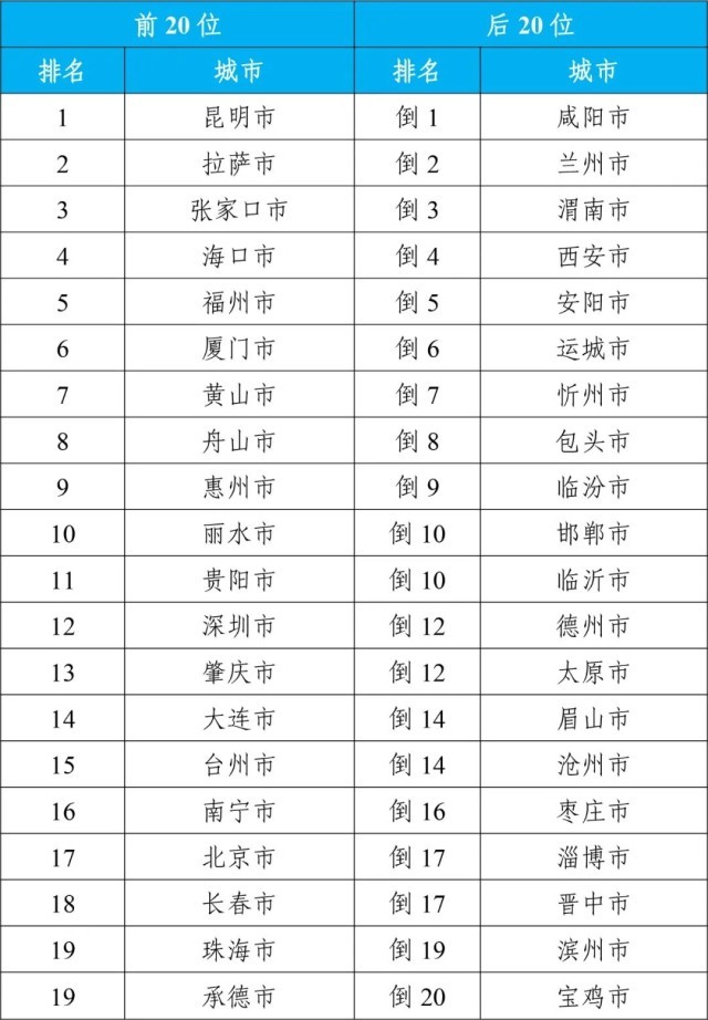 12月,168個重點城市中:空氣質量排名前20位城市依次是昆明、拉薩和張家口等城市(從第1名至并列第19名);空氣質量排名后20位城市依次是咸陽、蘭州和渭南等城市(從倒數(shù)第1名至倒數(shù)第20名)。見附表1。