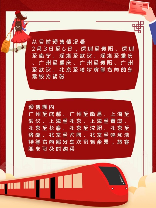 從目前預(yù)售情況看,2月3日至6日,深圳至貴陽、深圳至南寧、深圳至武漢、深圳至重慶、廣州至重慶、廣州至貴陽、廣州至武漢、北京至哈爾濱等方向的車票較為緊張。預(yù)售期內(nèi),廣州至成都、廣州至南昌、上海至武漢、上海至北京、上海至青島、北京至長春、北京至沈陽、北京至濟(jì)南、北京至大同、北京至呼和浩特等方向部分車次仍有余票,旅客朋友可及時(shí)購買。