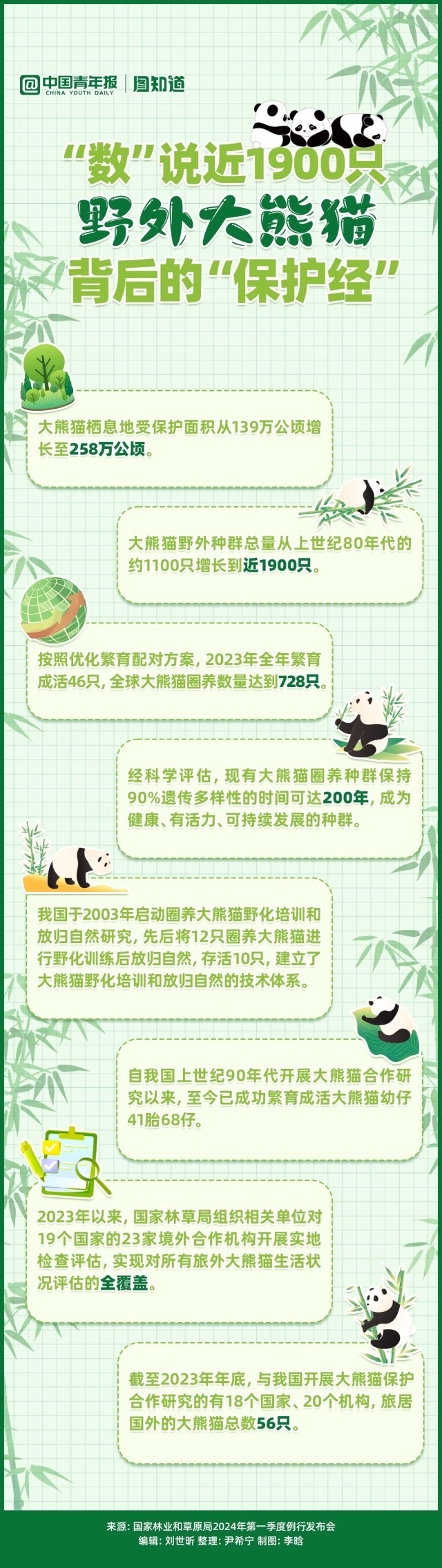 由“瀕危”到“易危”,我國為“國寶”大熊貓做了哪些保護工作?國家林業(yè)和草原局2024年第一季度例行發(fā)布會通報,現(xiàn)有大熊貓圈養(yǎng)種群保持90%遺傳多樣性的時間可達200年。此外,我國已實現(xiàn)對所有旅外大熊貓生活狀況評估的全覆蓋。跟著數(shù)據(jù),一起了解可愛“四腳獸”背后的“保護經(jīng)”。
