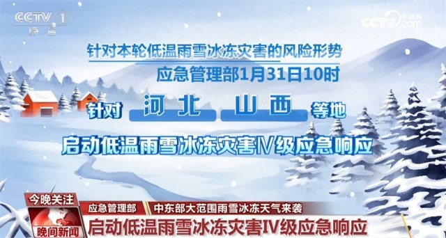 針對本輪低溫雨雪冰凍災害的風險形勢,應急管理部1月31日10時,針對河北、山西等地啟動低溫雨雪冰凍災害Ⅳ級應急響應。同時,國家防災減災救災委員會辦公室、應急管理部等部門派出2個工作組分赴河南和湖北,協(xié)助指導低溫雨雪冰凍災害防范應對工作。中國氣象局1月31日上午啟動重大氣象災害(雨雪冰凍)Ⅲ級應急響應。
