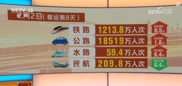 2024年綜合運(yùn)輸春運(yùn)工作專(zhuān)班數(shù)據(jù)顯示,春運(yùn)前8天,超15.5億人次出行。2月2日,也就是春運(yùn)第八天,全社會(huì)跨區(qū)域人員流動(dòng)量超2億人次,為2024年春運(yùn)以來(lái)跨區(qū)域人員流動(dòng)最多的一天。