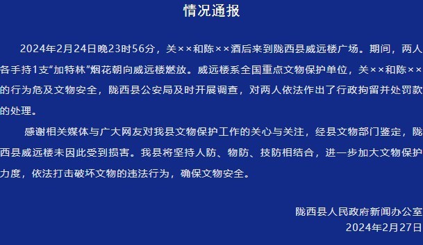 2024年2月24日晚23時(shí)56分,關(guān)××和陳××酒后來(lái)到隴西縣威遠(yuǎn)樓廣場(chǎng)。期間,兩人各手持1支“加特林”煙花朝向威遠(yuǎn)樓燃放。威遠(yuǎn)樓系全國(guó)重點(diǎn)文物保護(hù)單位,關(guān)××和陳××的行為危及文物安全,隴西縣公安局及時(shí)開(kāi)展調(diào)查,對(duì)兩人依法作出了行政拘留并處罰款的處理。