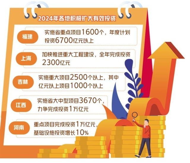 各地2024年政府工作報(bào)告中對今年如何擴(kuò)大有效投資進(jìn)行了系統(tǒng)部署,不少地方還公布了具體金額。比如,福建將謀劃實(shí)施省重點(diǎn)項(xiàng)目1600個(gè)、年度計(jì)劃投資6700億元以上;上海今年將加快推進(jìn)重大工程建設(shè),全年完成投資2300億元;吉林今年計(jì)劃實(shí)施重大項(xiàng)目2500個(gè)以上,其中億元以上項(xiàng)目1000個(gè)以上;江西今年實(shí)施省大中型項(xiàng)目3670個(gè),力爭完成投資1萬億元;河南重點(diǎn)項(xiàng)目完成投資1萬億元,基礎(chǔ)設(shè)施投資增長10%;安徽開展先進(jìn)制造業(yè)投資“領(lǐng)跑”計(jì)劃,制造業(yè)投資增長10%以上。