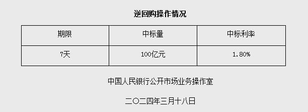 中新網(wǎng)3月18日電 據(jù)中國人民銀行網(wǎng)站消息,為維護(hù)銀行體系流動(dòng)性合理充裕,2024年3月18日人民銀行以利率招標(biāo)方式開展了100億元逆回購操作。具體情況如下: