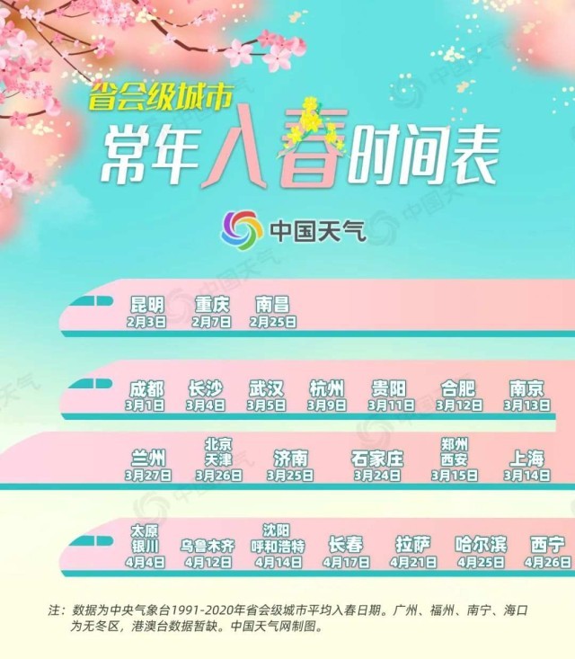 常年3月,是我國入春最集中的一段時間,此時往往有15個省會級城市完成冬春轉(zhuǎn)換。3月上旬,成都、長沙、武漢、杭州等地率先進入氣象學(xué)意義上的春天;3月中旬,貴陽、合肥、南京、上海、鄭州、西安等地邁入春天的門檻;3月下旬,華北、黃淮一帶的石家莊、濟南、北京、天津等地也投入春的懷抱。