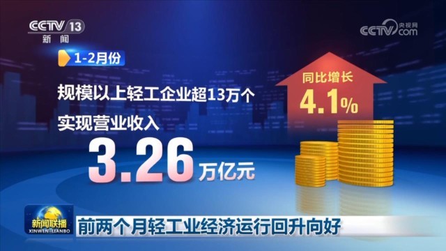 央視網(wǎng)消息(新聞聯(lián)播):中國(guó)輕工業(yè)聯(lián)合會(huì)發(fā)布數(shù)據(jù)顯示,今年前兩個(gè)月,消費(fèi)品制造業(yè)發(fā)展動(dòng)力增強(qiáng),帶動(dòng)輕工業(yè)經(jīng)濟(jì)運(yùn)行回升向好。1—2月,規(guī)模以上輕工企業(yè)超13萬(wàn)個(gè),實(shí)現(xiàn)營(yíng)業(yè)收入3.26萬(wàn)億元,同比增長(zhǎng)4.1%。