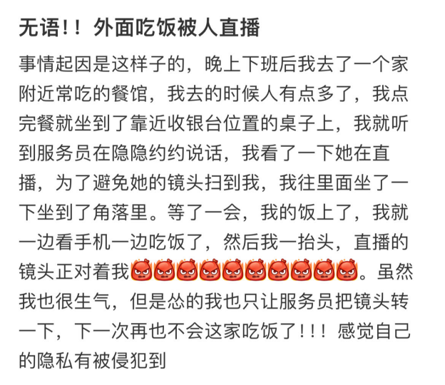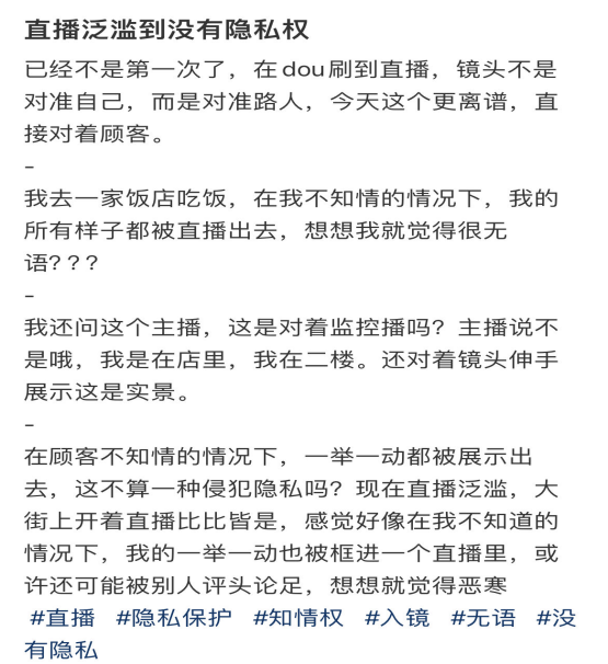 據(jù)媒體報道,近期,陜西西安兩名老人用餐時被商家拍下視頻,之后商家又私自將拍攝內(nèi)容發(fā)到網(wǎng)上,老人親戚無意刷到視頻才發(fā)現(xiàn)。在老人家屬與其多次溝通后,商家刪除了視頻。消費者多在不知情或者未被征詢意見的情況下被動充當商家直播或者拍攝短視頻的引流工具,除了自己的言行舉止可能被迫接受他人的凝視和審判外,還有面部信息泄露風險。