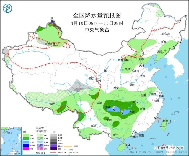 4月10日08時至11日08時,新疆北疆北部、黑龍江西北部、西藏中部和北部、青海東南部、川西高原北部等地部分地區(qū)有小到中雪或雨夾雪,其中,新疆北疆北部高海拔地區(qū)有大到暴雪,局地大暴雪(20~25毫米)。內(nèi)蒙古東部、華北北部、東北地區(qū)東部、新疆北部、西藏東部、四川盆地大部、重慶、江淮西部、江漢、江南北部和西部、貴州大部、廣西大部、云南西部和南部、海南島、臺灣島等地部分地區(qū)有小到中雨,其中,重慶東南部、貴州北部、湖南中西部等地部分地區(qū)有大雨(25~40毫米)。新疆東部部分地區(qū)有6~7級風。